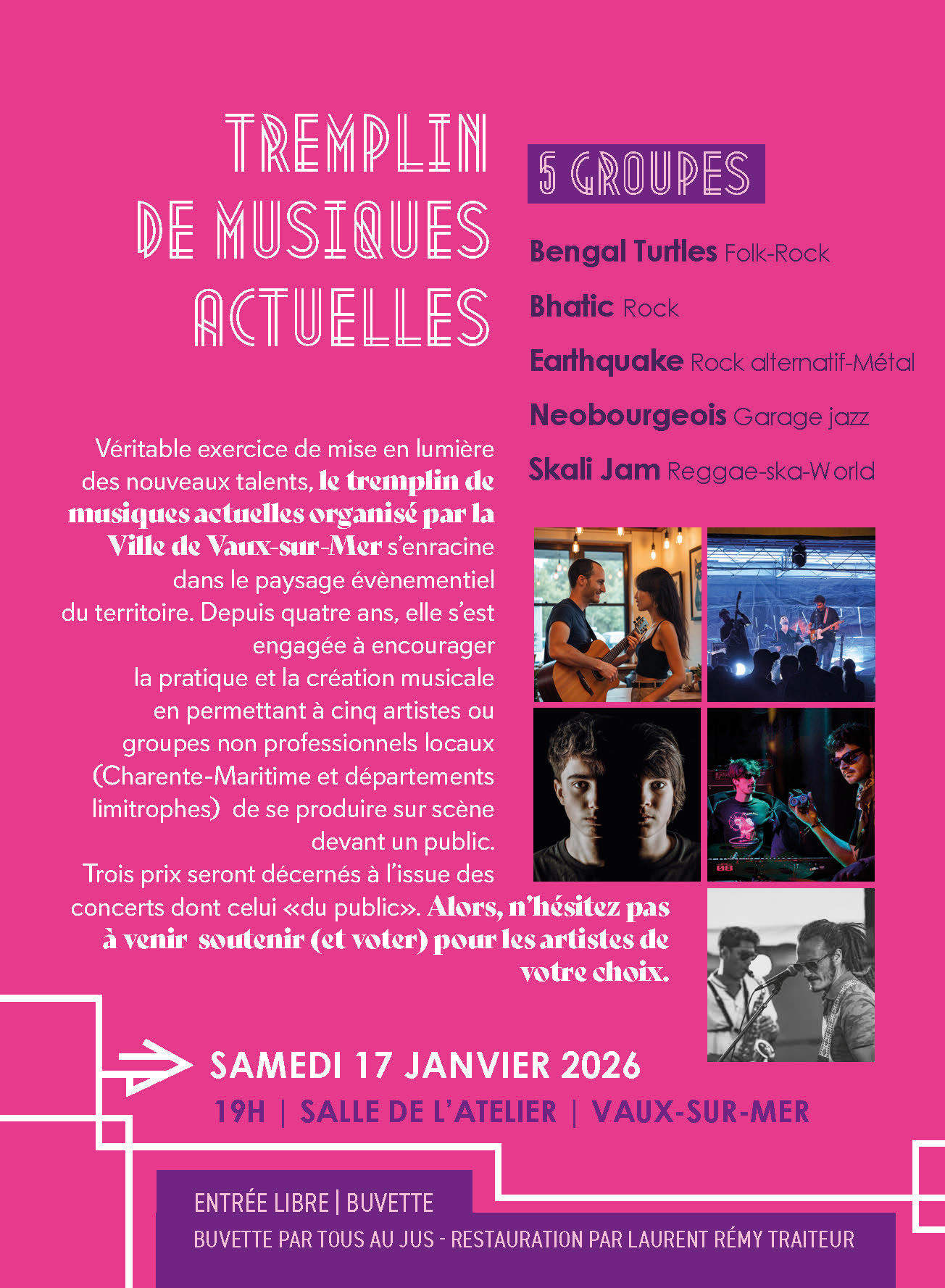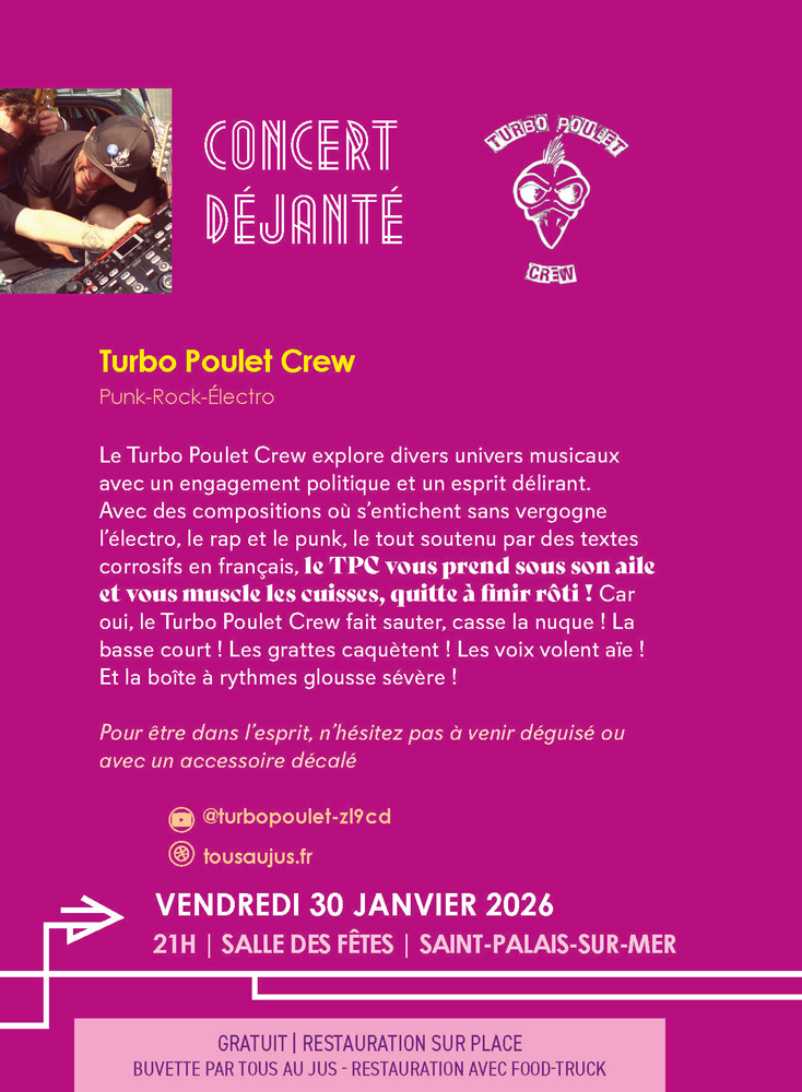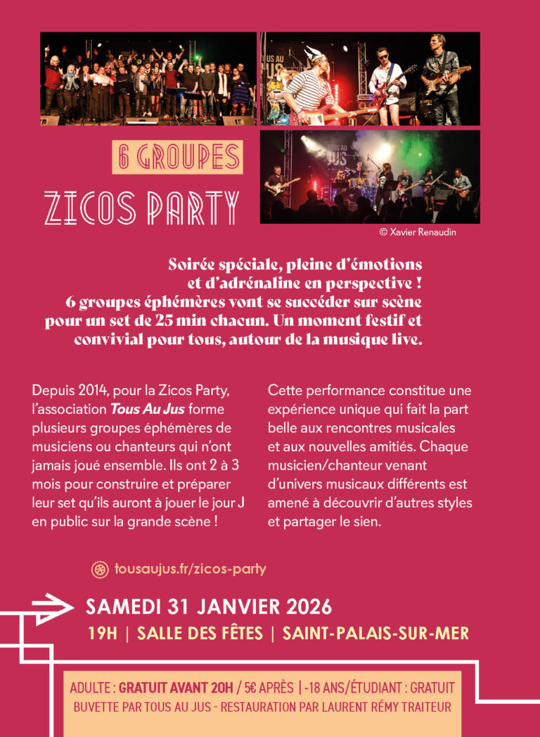 L’association « Tous Au Jus !!! » fédère les musiciens et chanteurs du territoire Royan Atlantique au sein d’événements saisonniers tout au long de l’année en collaboration avec les communes de la Communauté d’Agglomération de Royan Atlantique.