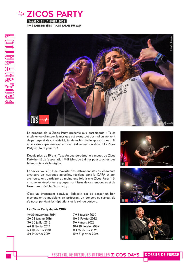 Chaque année l’association Tous au jus organise la Zicos party. L’objectif est de vous permettre de rencontrer d’autres musiciens amateurs du coin et de monter sur scène avec eux lors d’une soirée de concert.